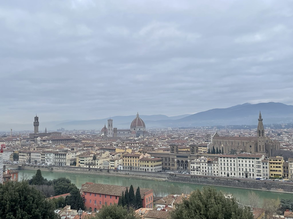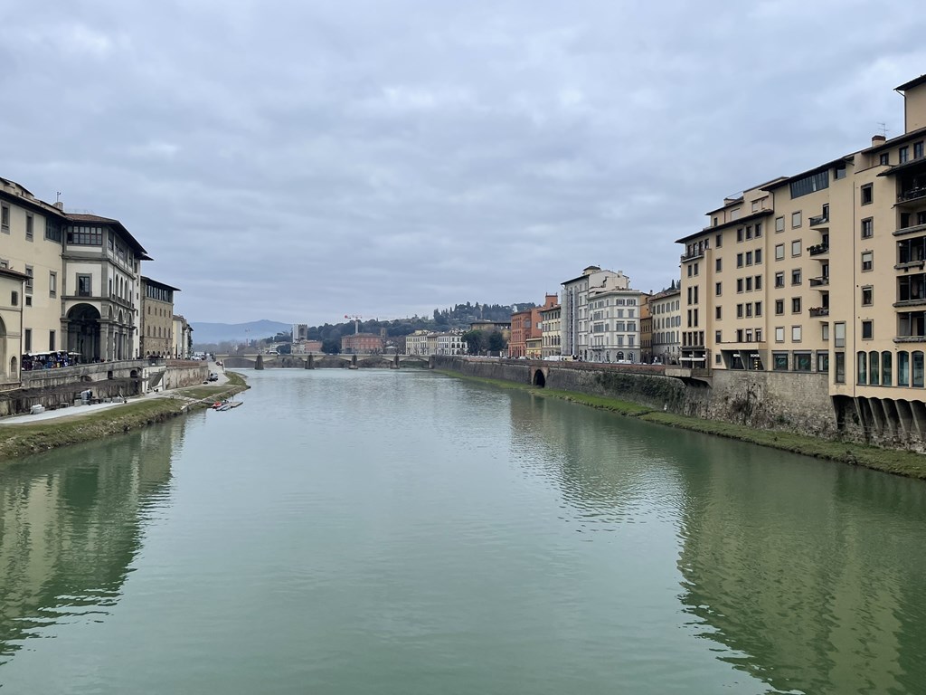 生憎の曇り空の中、ポンテ・ヴェキオを渡りつつミケランジェロ広場を目指して歩きます。